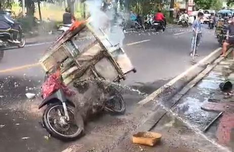Pada rombong itu berisi kompor dan gas, yang biasanya digunakan untuk menghangatkan kuah bakso. Sesaat parkir, tiba-tiba bagian bawah sepeda motor mengeluarkan api.