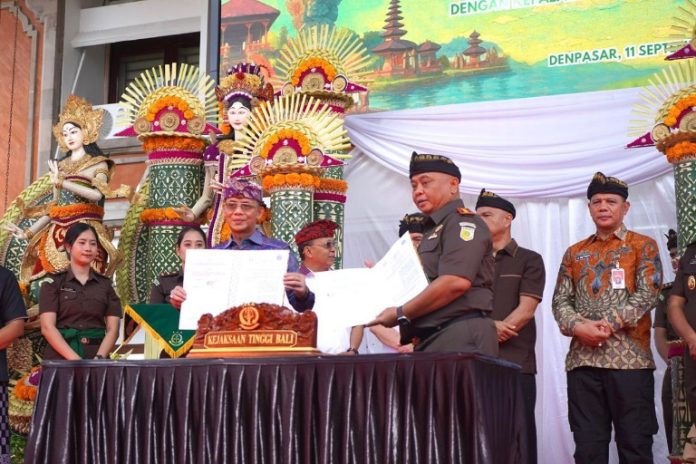 NARASIBALI.com, SEMARAPURA – Bupati Klungkung, I Made Satria menghadiri Peluncuran Program Jaga Desa disertai dengan Penandatanganan Perjanjian Kerjasama Antar Bupati/Walikota se-Provinsi Bali dengan Kepala Kejaksaan Negeri se-Provinsi Bali di Kantor Kejati Bali Denpasar, Kamis (11/9/2025). Hadir langsung Wakil Menteri Desa, Pembangunan Daerah Tertinggal, dan Transmigrasi RI, Ahmad Riza Patria, Gubernur Bali, Wayan Koster, Kajati Bali, Dr. Ketut Sumedana, S.H., M.H. serta Bupati/Walikota se-Bali.Program Jaksa Garda Desa (JAGA DESA) merupakan program yang mengawal penyaluran dan pemanfaatan dana desa untuk mencegah penyimpangan dan meningkatkan akuntabilitas pengelolaan keuangan desa. JAGA DESA juga bertujuan untuk membangun karakter bangsa yang taat hukum, memberikan edukasi, pendampingan hukum, serta menciptakan wadah seperti Bale Kertha Adhyaksa untuk musyawarah dan solusi permasalahan desa. “Saya sangat mengapresiasi dan mendukung penuh program ini, mari bersama-sama ikuti aturan pemerintah agar pembangunan di desa berjalan dengan baik dan transparan dengan tetap mematuhi peraturan,” harap Bupati Satria. roni/nbc