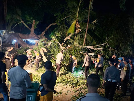 Personel Polsek Nusa Penida bersama masyarakat dan petugas pura segera melakukan pemotongan dan pembersihan pohon tumbang agar area persembahyangan kembali aman bagi umat.
