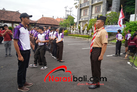 NARASIBALI.COM, SEMARAPURA – Wakil Bupati Klungkung, Tjokorda Gde Surya Putra mewakili Bupati Klungkung melepas Kontingen Kwarcab Klungkung untuk mengikuti Jambore Daerah (Jamda) Bali Tahun 2025 dihalaman depan Kantor Bupati Klungkung, Kamis (11/12/2025).