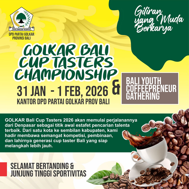 “Dari satu kota ke sembilan kabupaten, Golkar Bali hadir membawa semangat kompetisi, pembinaan, dan lahirnya generasi cup taster Bali yang siap melangkah lebih jauh,” demikian semangat yang diusung dalam ajang ini,” tegasnya.
