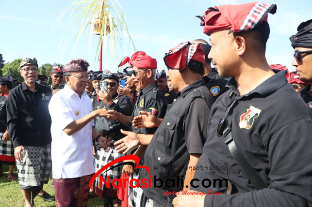 Usai memimpin upacara, Gubernur Koster melakukan inspeksi pasukan pecalang yang hadir dari seluruh desa adat se-Bali. Barisan pecalang menyambut inspeksi tersebut dengan penuh semangat.