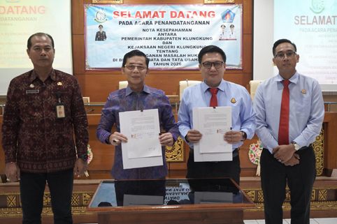 NARASIBALI.COM, SEMARAPURA – Perkuat sinergi hukum Pemerintah Kabupaten (Pemkab Klungkung) Klungkung jalin kerja sama strategis dengan Kejaksaan Negeri Klungkung melalui penandatanganan Nota Kesepahaman (MoU) tentang Permasalahan Hukum di Bidang Perdata dan Tata Usaha Negara (TUN) Tahun 2026. Penandatanganan tersebut dilakukan Bupati Klungkung, I Made Satria bersama Kepala Kejaksaan Negeri Klungkung, R. Indra Senjaya, S.H., M.H. di ruang rapat Praja Mandala Kantor Bupati Klungkung, Selasa (21/4/2026).