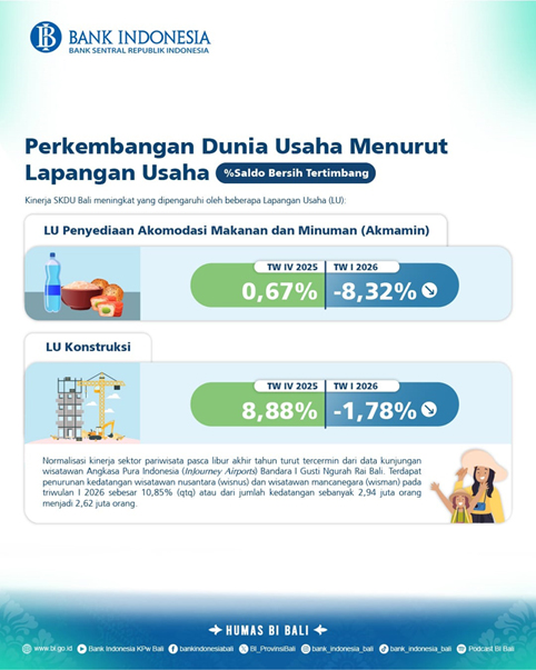 NARASIBALI.COM, DENPASAR – Melandainya SKDU Provinsi Bali pada triwulan I 2026 utamanya disebabkan oleh penurunan kinerja lapangan usaha (LU) utama seperti Penyediaan Akomodasi Makanan dan Minuman (Akmamin) dari 0,67% pada triwulan IV 2025 menjadi sebesar -8,32% pada triwulan I 2026 dan LU Konstruksi dari 8,88% pada triwulan IV 2025 menjadi -1,78% pada triwulan I 2026.